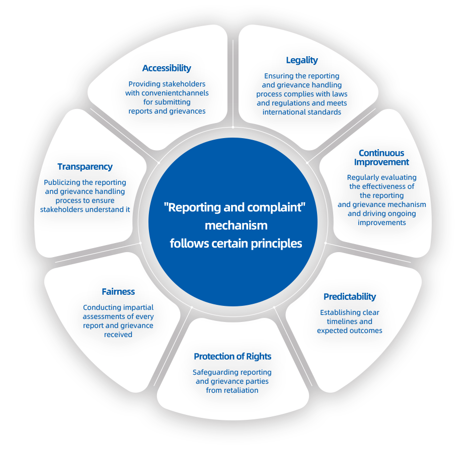 We provide accessible and effective reporting and complaint channels, which we believe are essential to our fulfillment of social responsibility. Our reporting channels include an online reporting portal, dedicated email, hotline, and postal mail, through which we receive reports and tips from employees and partners regarding unethical business conduct around the clock. These reporting channels are published on our website and promoted to all staff through internal communication software and bulletin boards. We clearly define the principles of our reporting and complaint mechanism and strive to build an efficient, transparent, and impartial system.